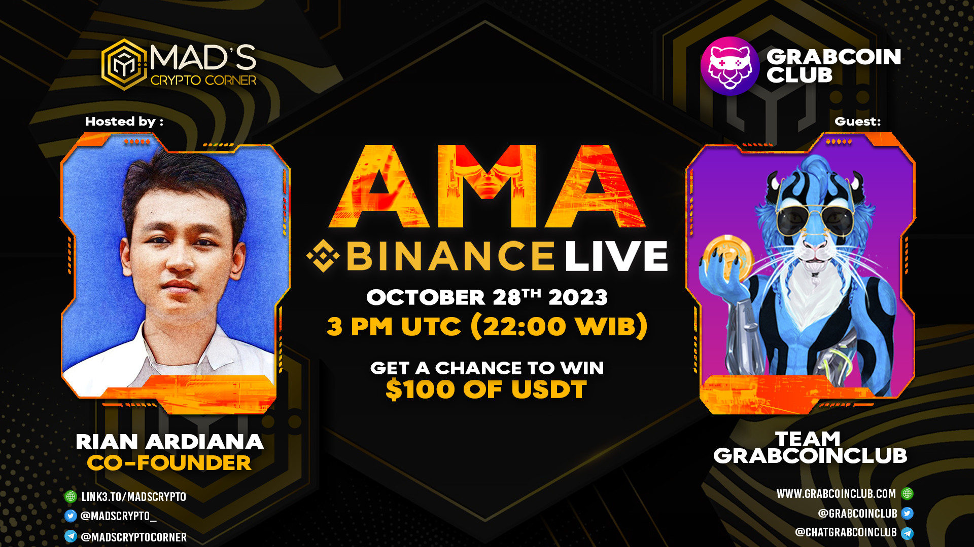 🏠 Venue: https://bit.ly/AMArathonGrabCoinClub⏰ Time: Saturday, October 28th 2023, 2 PM UTC💰 Reward Pool: 100 of $USDT